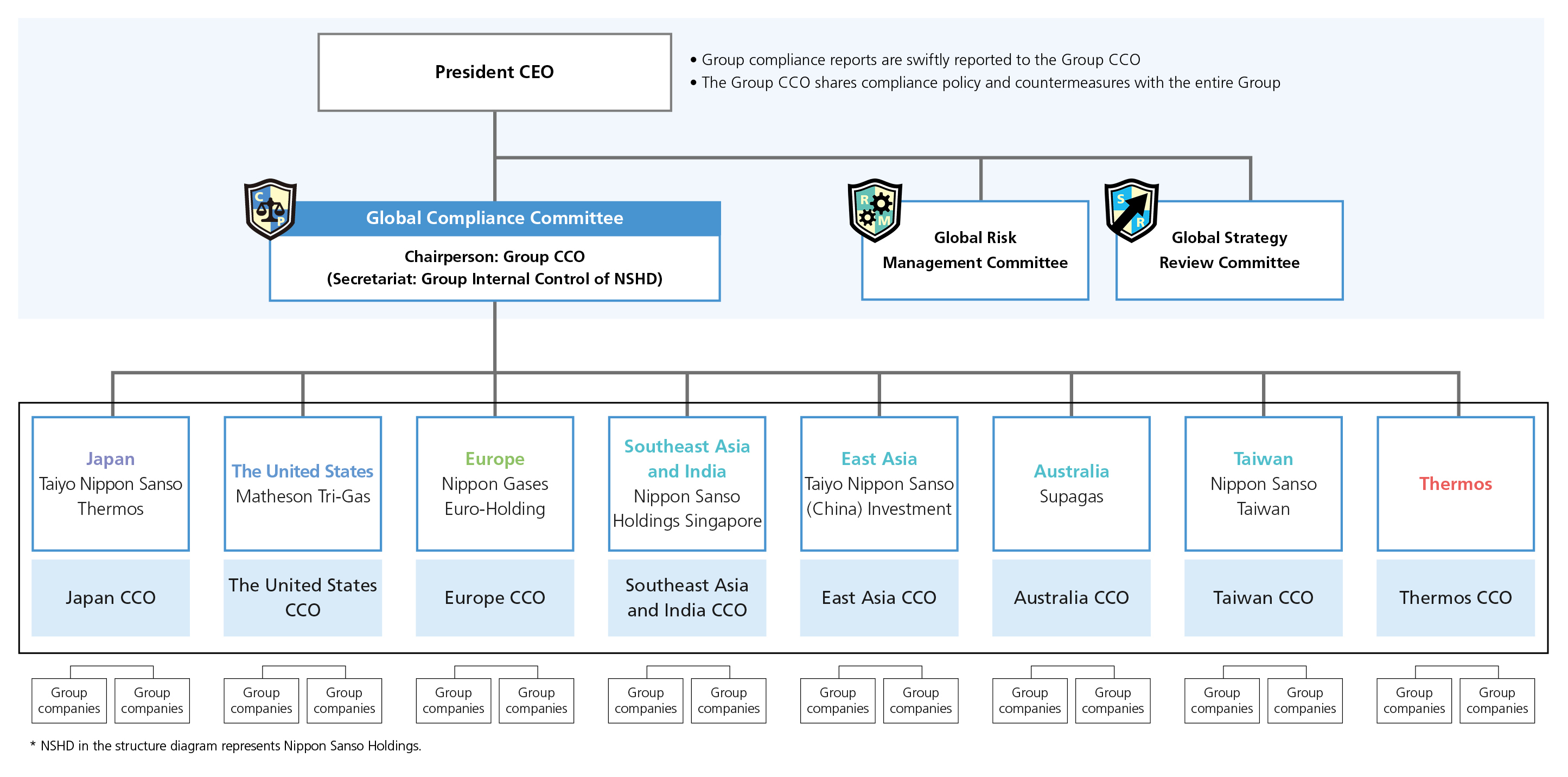 The NSHD Group has determined a basic internal control policy for our Group and established organizations and regulations to ensure its effectiveness. Specifically, we have a Group Chief Compliance Officer (GCCO), appointed by the Board of Directors, who appoints Regional Chief Compliance Officers (RCCOs) in Japan and regions overseas. Under the direction and supervision of the GCCO, the RCCOs conduct compliance promotion activities based on the characteristics of each region and business.