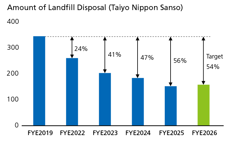 Promoting the 3Rs (reduce, reuse, recycle) of waste processing is a requirement of our times. We will set and pursue KPIs for each operating company to reduce waste emissions and landfill volume. For example, in Japan, the Taiyo Nippon Sanso Group will work to halve its industrial waste landfill disposal by FYE2026 comparetd to FYE2019 under its Halve Amount of Landfill Disposal (HALD) initiative that was launched in FYE2022. Nippon Sanso Holdings is making steady progress toward achieving its targets by selling valuable materials in disposed high-pressure gas containers and by thoroughly separating and recycling waste, having achieved a 56% reduction in FYE2025.