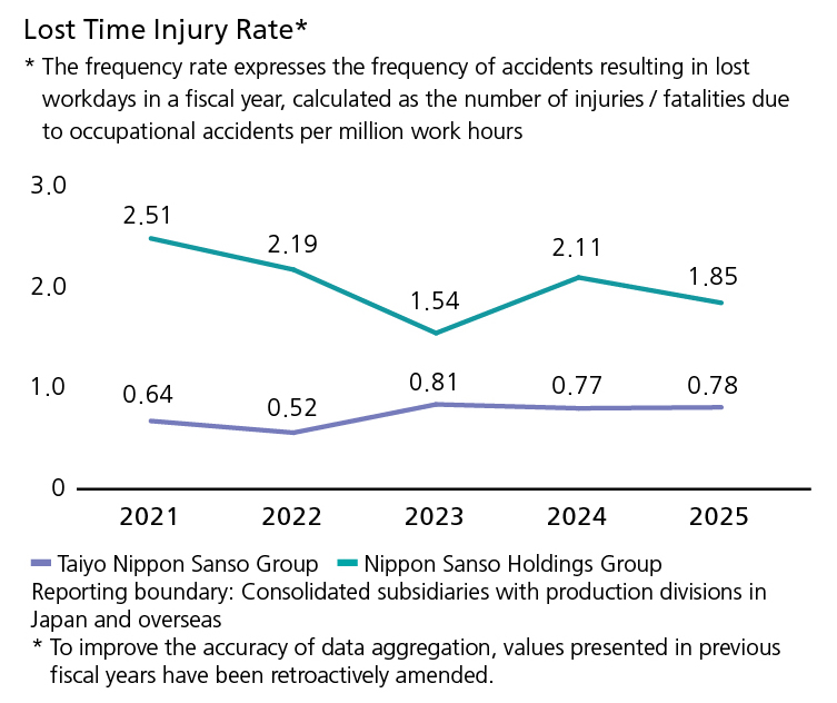 For the NSHD Group, which handles various high-pressure gases, safety forms the foundation of its corporate existence. With the mindset that “selling gas is selling safety,” we have designated the lost time injury rate as an essential safety KPI for maintaining a safe and reliable supply of gases. As a Group KPI, we aim to maintain the lost time injury rate (time lost to injuries per one million working hours) at 1.6* or below.