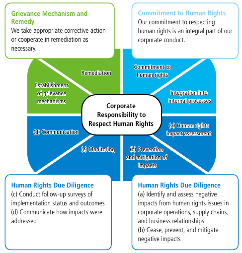 We have established a human rights due diligence system in accordance with the procedures outlined in the United Nations' Guiding Principles on Business and Human Rights, and we will assess a wide range of human rights issues — including the five ILO core labour standards set out in the ILO Declaration on Fundamental Principles and Rights at Work (freedom of association and collective bargaining, forced labour, child labour, discrimination, and occupational health and safety) — and disclose progress on them.