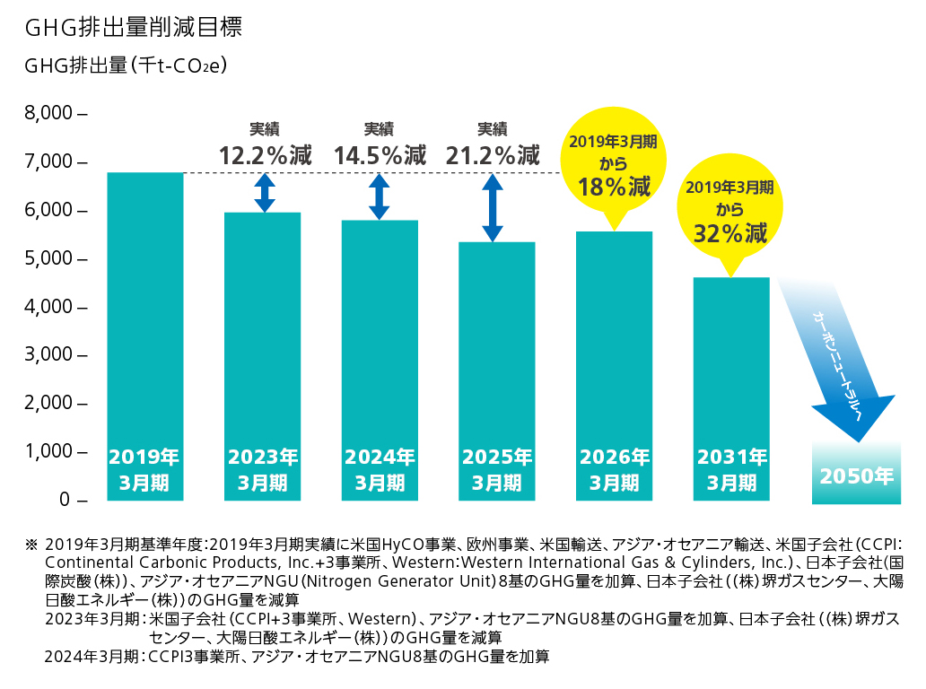 当社グループは、2050年カーボンニュートラルをめざすと共に、GHG排出量を2026年3月期18%、2031年3月期32%削減に取り組みます。この目標達成に向けた主な取り組みは、以下に示すように空気分離装置のリプレースやグリーン電力証書の購入、再生可能エネルギーの導入などになります。