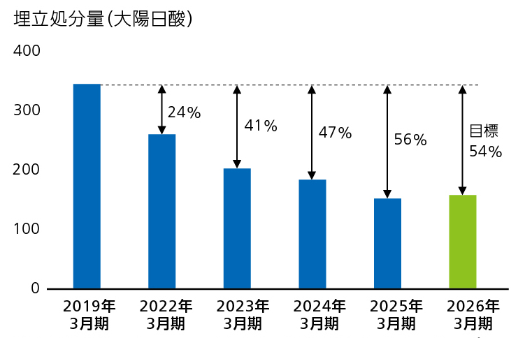 Disposal)と名付けた取り組みをスタートし、2026年3月期までに大陽日酸グループが排出する産業廃棄物の埋立処分量を2019年3月期比で半減させる目標に取り組んでいます。廃棄する高圧ガス容器の有価売却やリサイクル・分別廃棄の徹底などにより、2025年3月期は56%減と現在のところ目標達成に向けて順調に推移しております。