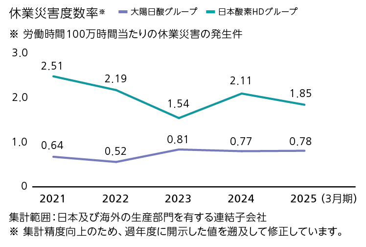さまざまな高圧ガスを取り扱う当社グループにおいて、安全は企業存立の基盤をなすものであり、「ガスを売ることは、安全を売ること」の精神に則り、安全・安定供給の継続のための重要な保安のKPIとして休業災害度数率の目標(グループKPIとして、「休業災害度数率(労働時間100万時間当たりの休業災害の発生件数)」を1.6*以下)を設定しています。