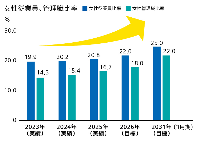 女性活躍にはKPIを定めてグループ全体で、推進スピードの向上を図りながら、重点的に取り組んでおります。また、異なるバックグラウンドを持つ社員が共に学び、成長し、視野を広げるための地域を超えた人財交流を推進します。